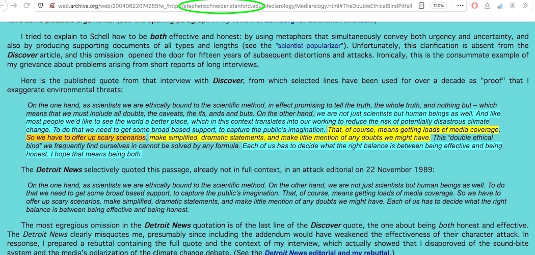 *(full context here, his quote paragraph is about halfway down the page under the "The "Double Ethical Bind" Pitfall" heading: http://web.archive.org/web/20040622074255fw_/http://stephenschneider.stanford.edu/Mediarology/Mediarology.html#TheDoubleEthicalBindPitfall )
