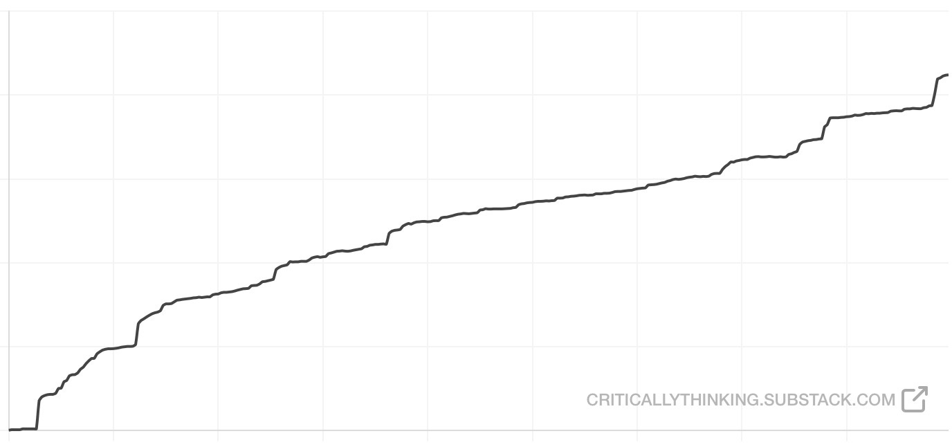 Anyways, I’m asking for YOUR HELP. I’m willing to keep doing this for free, but we need to get more subscribers. PLEASE email your associates and ask them to subscribe. PLEASE share my substack on social media, and ask readers to subscribe. FYI, here is the chart for the subscriber growth to date. Thank you for your help with that. Getting more people educated about what is going on is in ALL of our interests!